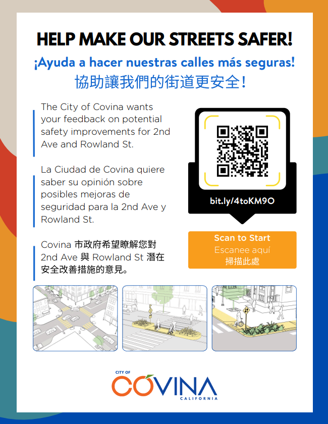 We want to hear from you! The City is gearing up to submit an application for Caltrans ATP Cycle 8 Funding. If awarded, the City would use these funds to improve Second Avenue and Rowland Avenue, including expanding and updating bicycle lanes and improving pedestrian paths and crosswalks. Scan the QR code or visit bit.ly/4toKM9O to provide feedback. The survey takes about 3 to 5 minutes to complete.